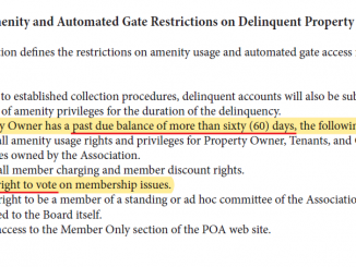 Her only ownership interest is a fractional 10% stake in an Amenity Lot, obtained through a special arrangement with members of the Developer’s team. In other words, the woman deciding how our elections are run does not actually live under the rules and covenants the rest of us abide by. Instead, she resides comfortably in neighboring Blackwell Village.