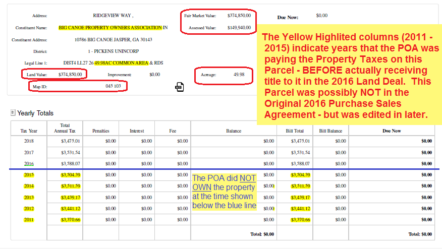 While there was nothing wrong with the transfer of the Roadways, and it was seemingly done completely “by the book” so to speak – something else happened at the same time that was NOT “by the books” – and this involved Pickens County Parcel 045-103, which is the 49.98 Acres of “Common Area” that is within the Bluffs Neighborhood.  This was NOT transferred to the Big Canoe Property owners in the 2009 Deed, but was retained by the Developer – but in the Pickens County Parcel records, the Common Area Ownership was switched in the accounting records as being owned by the Big Canoe Property Owners Association AND the POA started paying the Developer’s Property Tax ObligationsSix (6) years before we owned the property.