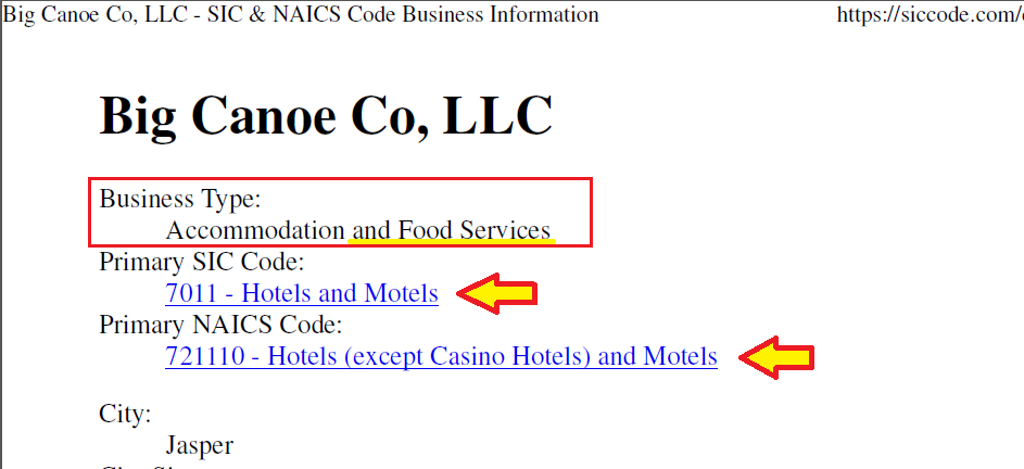 • We know that Big Canoe Company LLC has an SIC/NAICS Code Description as an “Accomodation and Food Service” Company, and is still currently active with the Secretary of State.