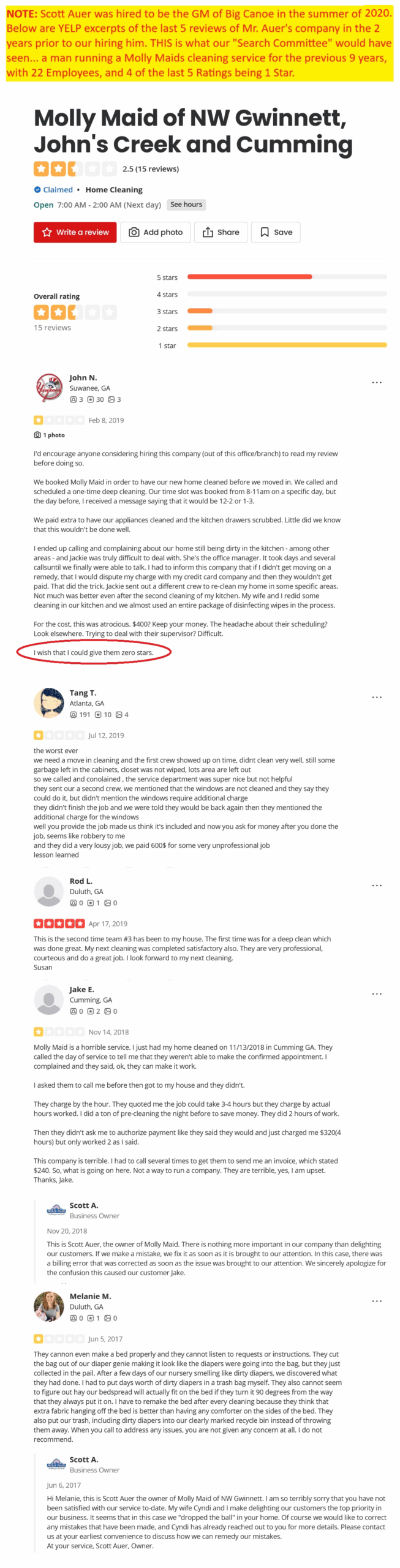 Because the last 4 out of 5 reviews prior to his hiring, that we saw on YELP for his Molly Maids business – were “1-Star” Reviews, and in 2 of them, you can even find Scott Auer, responding to the bad reviews in that same familiar spinlike manner that Big Canoe property owners have grown accustomed to. Don’t believe me – look at these excerpts – and you can see “Scott Auer, Owner” responding to his cleaning customers.