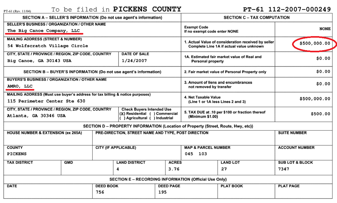 AMRO similarly leveraged Appalachian Bank for an enormous loan to buy Parcel 045-103-047 from the Big Canoe Company.  IMMEDIATELY thereafter, using this recent “arm’s length transaction” to set an initial, incredibly high Appraisal Value for lots in this new subdivision….. the Big Canoe Company started selling lots.  And sell they did…. within the next 2 months small parcels of dirt were sold for $350,000, $299,900, $284,900, and $249,900.  The entire thing was an amazing bit of “coincidental timing”, which we should recap…..