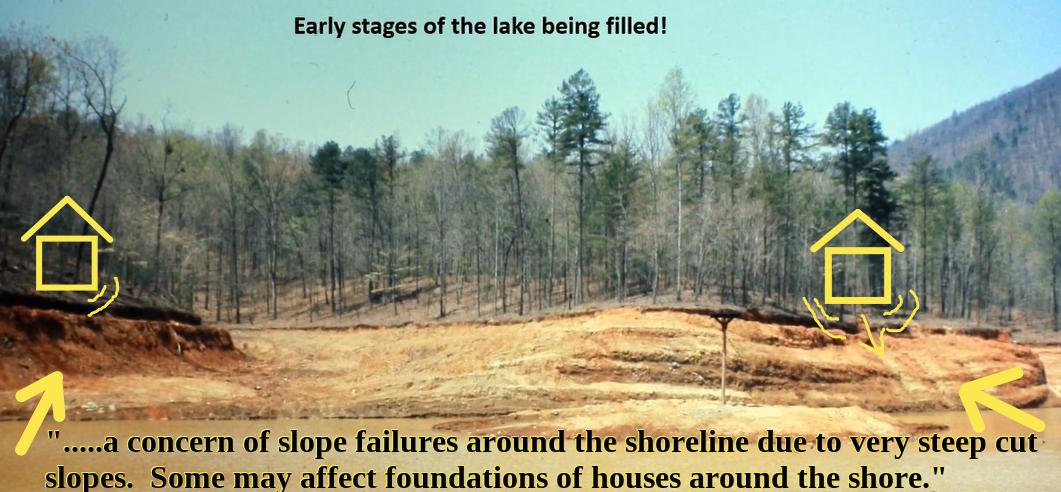 “He (Tom R) asked about lowering the lake slowly because of a concern of slope failures around the shoreline due to very steep cut slopes (example picture). Some may affect foundations of houses around the shore.”