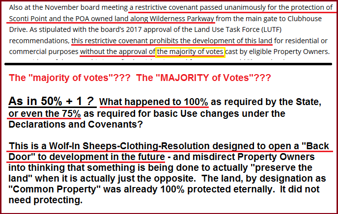 THEN, I started publicly unraveling everything with my pesky investigations in the early Fall of 2018. They then realized what a screw up they had on their hands – but they were unwilling to let go of their development plans. Realizing that there was ZERO chance that they would ever get 100% Voter Approval in the future to allow development of the Wilderness Parkway Property (as was actually recommended by the LUTF) – they cooked up this “Feel Good” restrictive covenant that contained a back door that would allow development with only 51% Voter Approval. They figured that in a few years, like everything else in this community, they could trot out some once-in-a-lifetime development scheme, reference their ability to do it through this resolution with 51%, and everyone would shrug and not ask questions. Next they would put the “get-the-vote” gears in motion – organize the Sidebar and Neighbor-to-Neighbor Facebook group admins to launch their “Censored Echo Chamber” discussions; work with the Smoke Signals to write puffy stories; use Inside the Gates to issue official statements of support; hold some Rah Rah Meetings; and they would lock in that 51% with ease! And the land would get developed by some insider group for a nice incestuous game of “lets all make money off the Property Owners!”