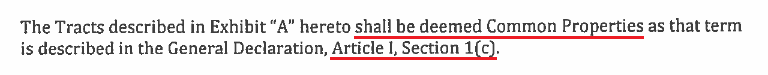 The Land was deeded conditionally as “Common Property.” Below is the excerpt, which is found in both deeds (for clarification, ALL of the land in each Deed is listed under “Exhibit A”), so absolutely everything was transferred as Common Property.