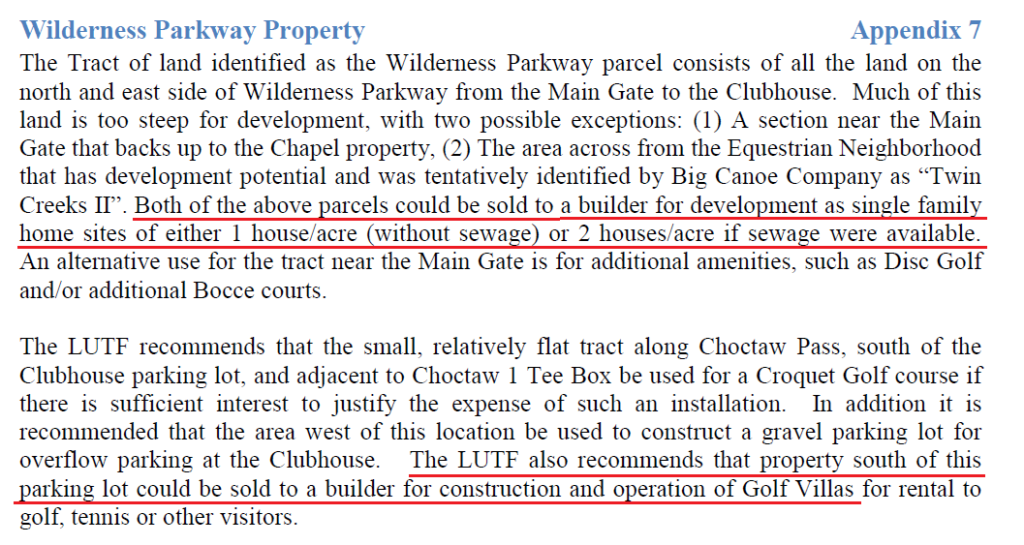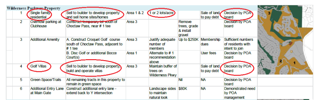 What I am going to tell you next may shock you…. that the POA was actually UNAWARE that we were receiving this land as Common Property. They were absolutely clueless to this fact. This is evidenced by their own statements, and the recommendations made to the Board by the Land Use Task Force, who worked on a land use report for a full TWO (2) years after the close of the Sale. Below is the text recommendation in Page 11 of the final Land Use Report for the Wilderness Parkway Property: