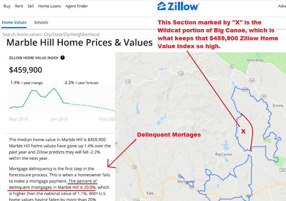 Snippet-0005: The percent of delinquent mortgages in Marble Hill is 20.0%, which is higher than the national value of 1.1%.  This area includes a portion of the northeast section of Big Canoe.  Data shows that Big Canoe currently only has 2 foreclosed properties (both are lots); Source: https://www.zillow.com/marble-hill-ga/home-values/