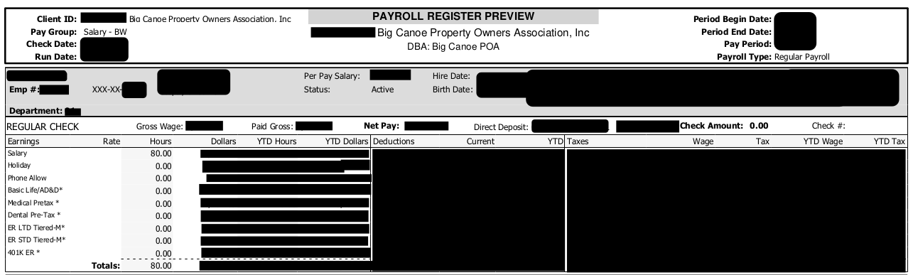 FOBC has been provided with a full 2 Week “Payroll snapshot” of Big Canoe POA Employees, including salaried and hourly employees. The data obtained was in unedited internal report format. FOBC has made the decision to release the data in redacted format, with only the highest paid staff revealed by name (as is already routinely released in the Annual Non-Profit 990 IRS Reports)