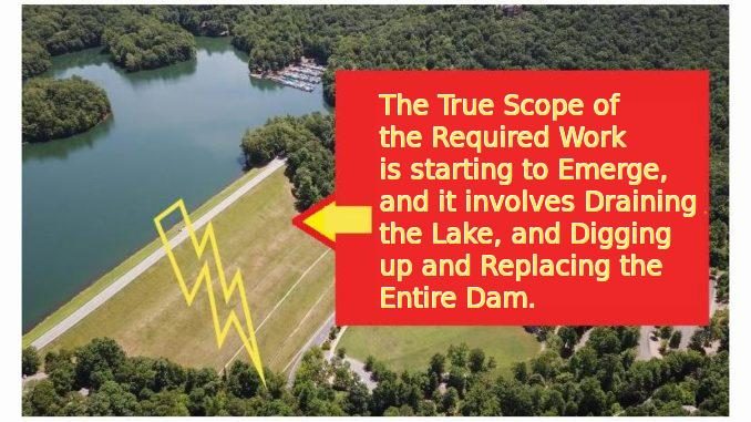 So basically, Big Canoe’s BS Plan that they said they could do earlier for 5 – 7 Million Dollars by creating a new “Pump System” to drain the Lake has apparently been nixed by Ga Safe Dams (as predicted) – and we are back to draining the lake completely, digging up the entire center of the Dam all the way to the bottom, replacing the Lower level drain pipes, and then Rebuilding the Dam. If you ever wondered why Big Canoe needed a 20 Million Dollar Line of Credit, now you can start to get the idea. My prediction is that they are going to need a MUCH bigger loan ($$$) to handle the scope of what is coming.