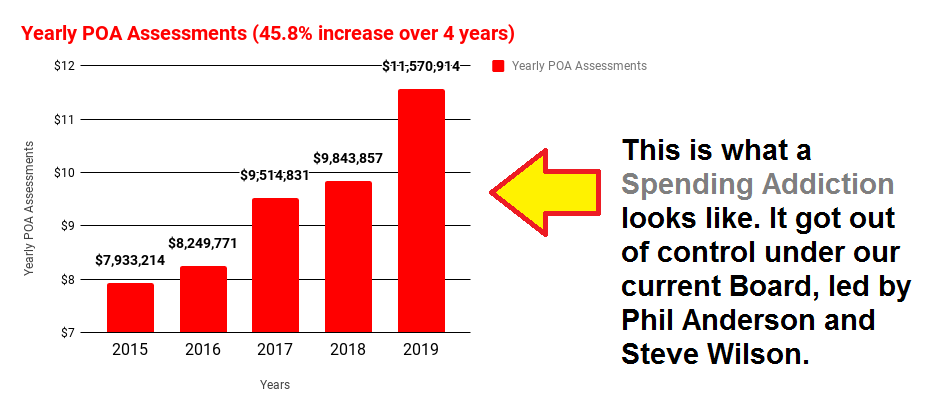 And of course, let us not forget the 2016 Land Deal that got us here in the 1st place, and has tied up our Amenities as collateral for 8 more years. But the Board still can’t stop spending! (Eventually this is going to drive our Property Values into the dirt, and it is going to drive some residents and lot owners OUT! I am already hearing lots of talk about this, and our Lot prices are already in steep decline as increasing holding costs make lot ownership a bad investment.)