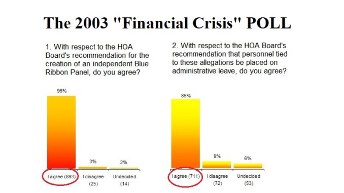 Yet with similar allegations back in 2003, there were almost a dozen Smoke Signals articles; an Emergency HOA Board Meeting; and Emergency Community Meeting put together by Property Owners; Two POA Town Hall Meeting in a single month on the subject; a community wide Newspaper Poll; the GM was put on-leave (and eventually released); a Blue Ribbon Committee set up; and an outside financial investigation launched.